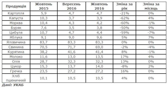 "Ціни на яловичину у жовтні, порівняно з вереснем, не зазнали значних змін через низький рівень торговельної активності та врівноваження попиту та пропозиції. У той же час, вартість свинини та курятини знизилась на 4% та 1% відповідно, що пов’язано зі скороченням попиту. У вересні спостерігався суттєвий ріст цін на свиней живою вагою, після чого попит і ціна на продукцію знизилися. Вартість яблук зросла через збільшення продукції більш дорогих сортів, що зумовило незначний ріст. Вартість молока у жовтні зросла на 4%, що було цілком очікуваним трендом, який сформувався під впливом росту цін на сировинне молоко. Наразі закупівельні ціни на молоко вищого ґатунку складає близько 8 грн/кг, разом з тим ціни на олію, хліб та гречану крупу не змінилися, цукор подорожчав на 2%", - йдеться у повідомленні.