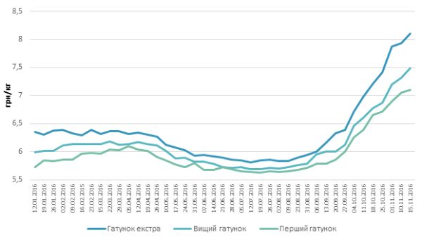 За результатами моніторингу, станом на 15 листопада 2016 року, середня ціна на молоко екстра ґатунку зросла на 0,17 грн та склала 8,10 грн/кг. Найвищу ціну за нього платили на Сумщині - 8,57 грн/кг, а найнижчу - на Волині - 7,60 грн.