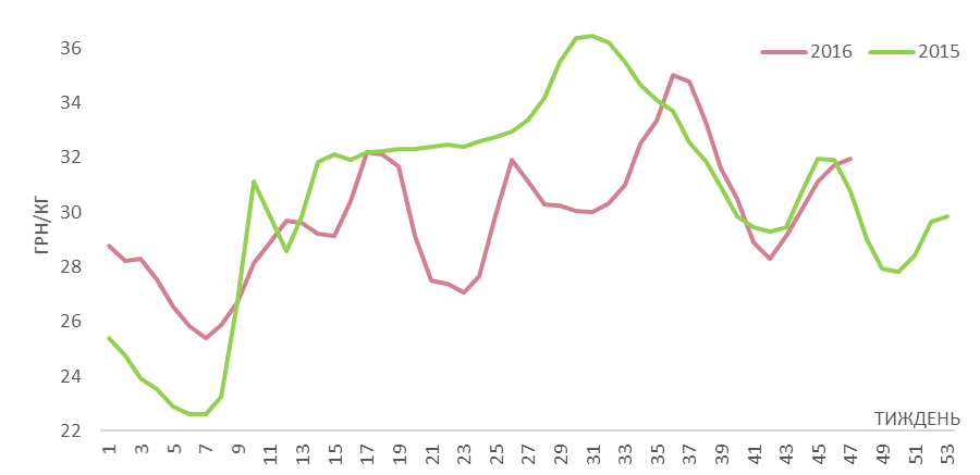 Також зазначається, що попереднього року в цю пору відзначився низхідний рух цін. Тож, якщо ціна 46-го тижня 2016 року була навіть нижчою ніж торік, то очікувана ціна поточного тижня може перевищити торішню на 3-4%.