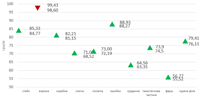 Також експертами відзначається зростання цін на свинину в роздрібній торгівлі, яке цього тижня торкнулося майже усіх м’ясних частин. Виключенням стала свиняча вирізка, середня ціна якої майже сягнула 100 грн/кг у першій половині місяця, проте вже у кінці другої декади понизилась до позначки 98,6 грн/кг. Водночас, стегнова частина, піднялася в ціні на 2,5 грн/кг, тож в середньому коштувала 71,03 грн/кг. Решта свинячих відрубів протягом попереднього тижня подорожчали на 0,6-1,2 грн/кг.