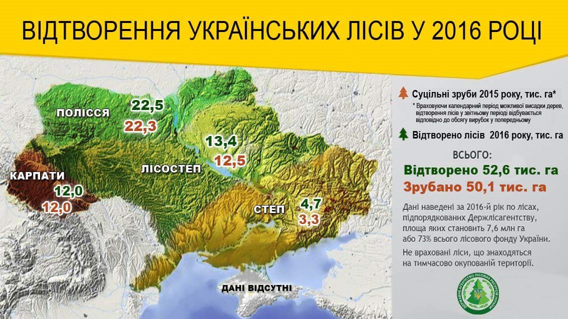 Так, на Поліссі в 2016 році було відновлено 22,5 тис. га лісів при площі зрубів 22,3 тис. га; у Лісостеповій зоні – 13,4 тис. га при площі зрубів 12,5 тис. га, у Степовій зоні – 4,7 тис. га при площі зрубів 3,3 тис. га; у Карпатах було висаджено 12,0 тис. га лісів при площі зрубів 12,0 тис. га.