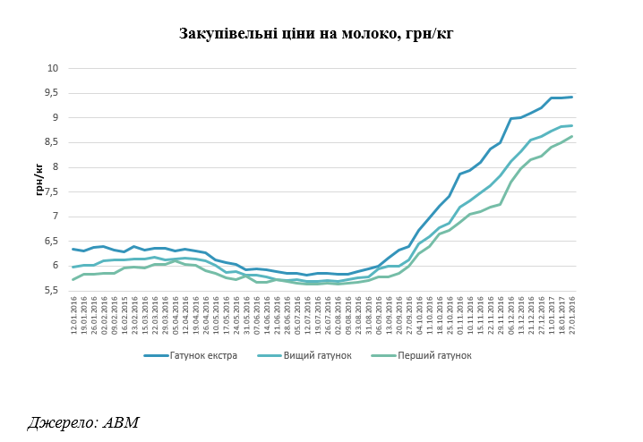 За підсумками останнього моніторингу від 24 січня середня закупівельна ціна на молоко екстра ґатунку зросла ще на 0,02 грн та склала 9,43 грн/кг. Найвищу ціну за таке молоко пропонують на Сумщині - 10,10 грн/кг, а найнижчу - на Волині - 8,40 грн.