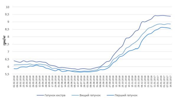 Так, станом на 14 лютого 2017 року, середня ціна на молоко екстра ґатунку склала 9,48 грн/кг, що на 2 копійки нижче попереднього тижня. Найвищу ціну за таке молоко платили у Черкаській області - 9,46 грн/кг, а найнижчу у Хмельницькій - 9,10 грн.