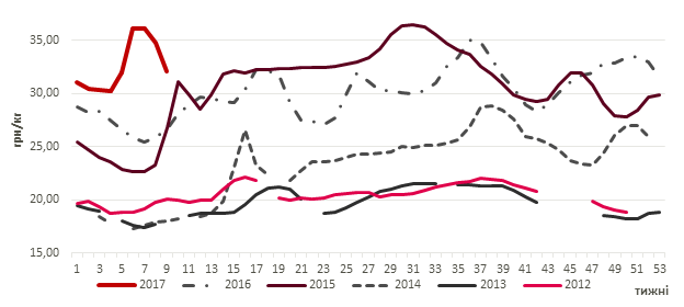 "Проте підсумки п’ятничних торгів свідчать про посилення цієї тенденції на рубежі сезонів. Зокрема, плановий діапазон цін на 9-й тиждень опустився до рівня 31-33 грн/кг, а середня цінова позначка у порівнянні з попереднім тижнем втратила понад 7%", - йдеться у повідомленні.