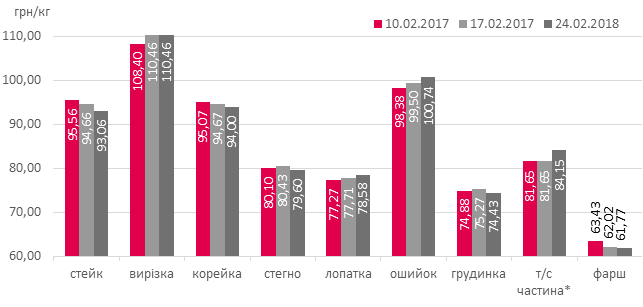 Роздрібні ціни на свинину також відчули деяке послаблення у кінці лютого. Так, середня ціна свинячих стейку та фаршу понизилась на 1,5 грн/кг, тоді як корейка, грудинка та стегно втратили менше 1 грн/кг. Водночас, ще не усі свинячі відруби інтегрували пониження цін на сировину, тому варто очікувати дещо нижчі ціни на свинину на полицях супермаркетів у перші дні весни.