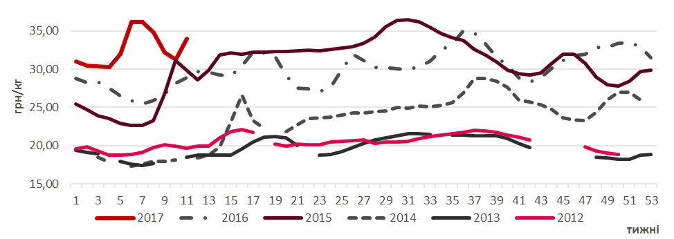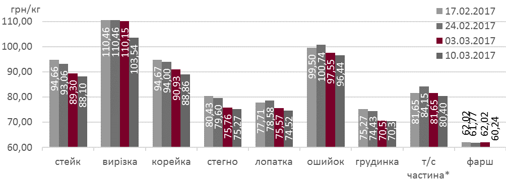 "Так, якщо в перші числа березня свинячі частини у торгівельних мережах в середньому подешевшали майже на 3%, то минулої п’ятниці їх пониження обмежилось 2%. Винятком стала лише ціна вирізки, яка подешевшала до 103,5 грн/кг (мінус 6,6 грн/кг порівняно з ціною 3-го березня), що співставно з її ціною в кінці січня. Варто відзначити, що станом на 10-те березня роздрібні ціни свинячих відрубів були в середньому на 5% меншими ніж місяцем раніше та співставні з їх рівнем у постноворічний період", - повідомили експерти.