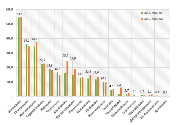 Найбільші площі засіяли на Вінниччині (54,5 тис га), Полтавщині (36,1 тис га), Хмельниччині (34,5 тис га) та Тернопільщині (22,5 тис га). Збільшення посівних площ в цьому році можна спостерігати в Черкаській та Полтавській області. В Харківській та Полтавській областях господарства значно відстають в посівних роботах через різке погіршення метеорологічних умов.