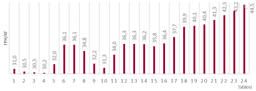 Тим не менш, вже в середині тижня подекуди озвучувалися і значно вищі ціни: деякі оператори із Західних областей «розписали» свинопоголів’я на цей тиждень по 45-46 грн/кг, а переробникам на Півдні країни пропонували товарні партії по 47-47,5 грн/кг.