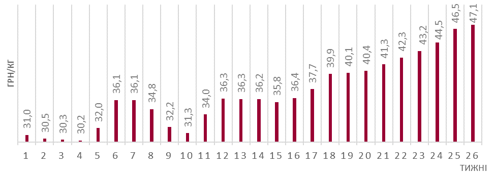Середня ринкова ціна живця у кінці червня на 5,8% вища ніж у середині місяця, коментують в аналітичному відділі АСУ.